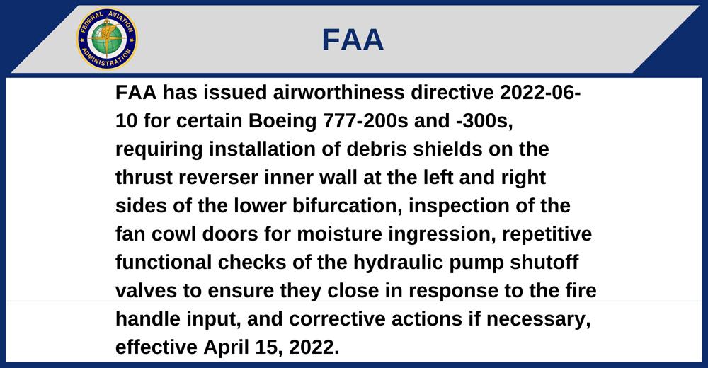 FAA has issued airworthiness directive 2022-06-10 for certain Boeing 777-200s and -300s, requiring installation of debris shields on the thrust reverser inner wall at the left and right sides of the lower bifurcation, inspection of the fan cowl doors for moisture ingression, repetitive functional checks of the hydraulic pump shutoff valves to ensure they close in response to the fire handle input, and corrective actions if necessary, effective April 15, 2022.