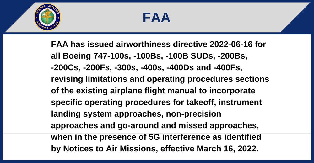 FAA has issued airworthiness directive 2022-06-16 for all Boeing 747-100s, -100Bs, -100B SUDs, -200Bs, -200Cs, -200Fs, -300s, -400s, -400Ds and -400Fs, revising limitations and operating procedures sections of the existing airplane flight manual to incorporate specific operating procedures for takeoff, instrument landing system approaches, non-precision approaches and go-around and missed approaches, when in the presence of 5G interference as identified by Notices to Air Missions, effective March 16, 2022.