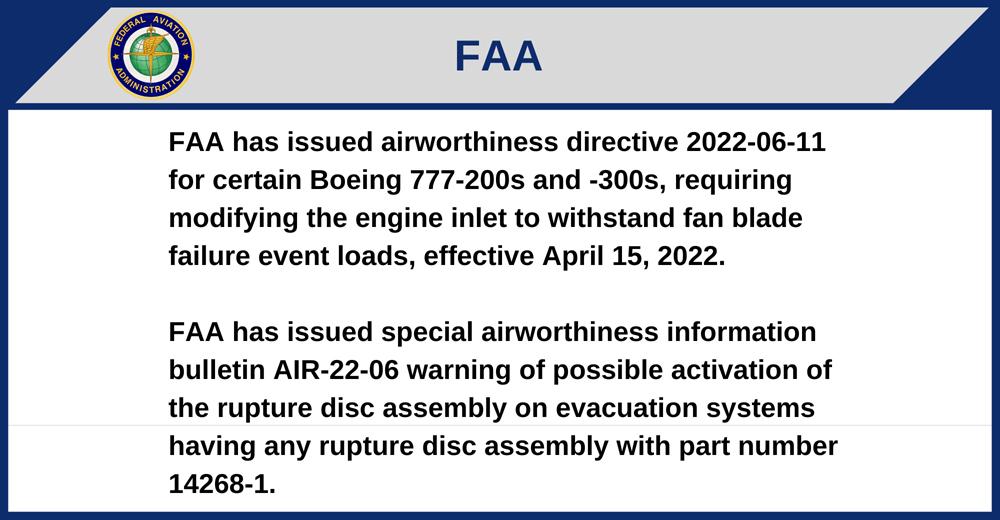 FAA has issued airworthiness directive 2022-06-11 for certain Boeing 777-200s and -300s, requiring modifying the engine inlet to withstand fan blade failure event loads, effective April 15, 2022.