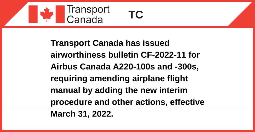 Transport Canada has issued airworthiness bulletin CF-2022-11 for Airbus Canada A220-100s and -300s, requiring amending airplane flight manual by adding the new interim procedure and other actions, effective March 31, 2022.