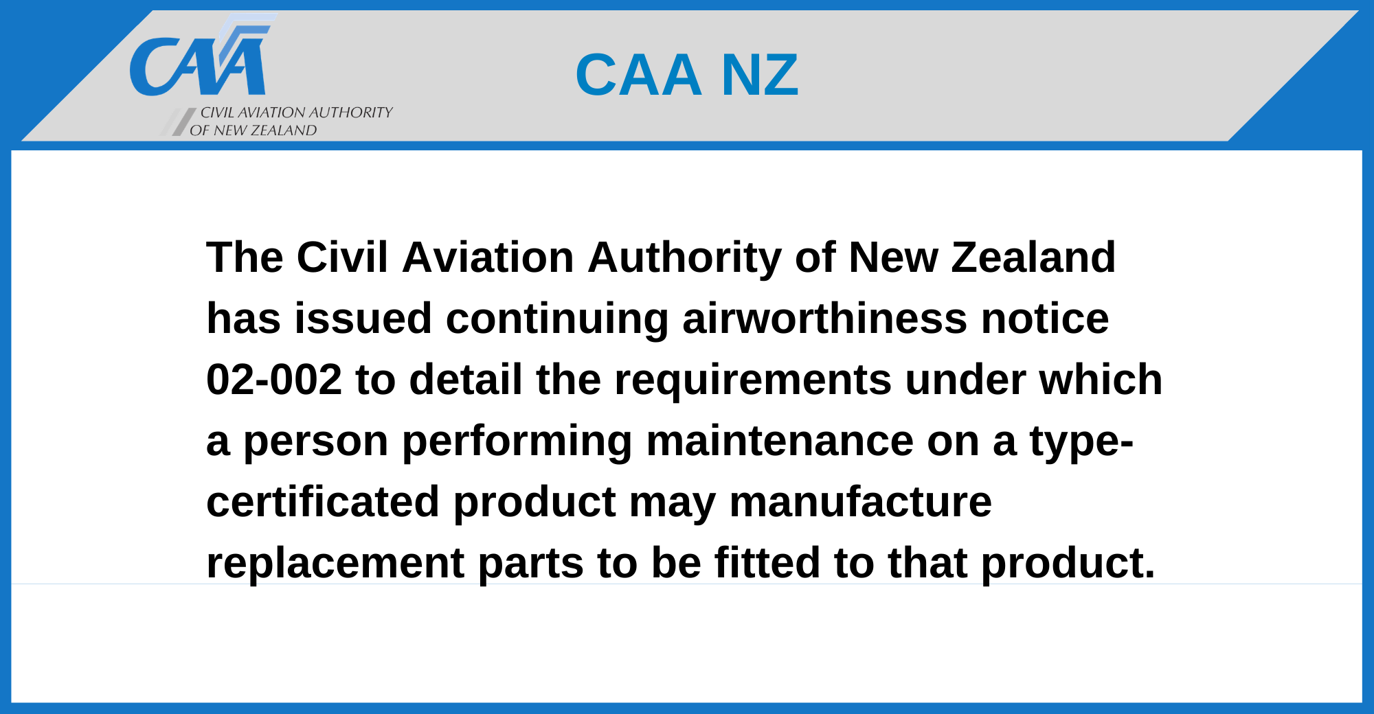 The Civil Aviation Authority of New Zealand has issued continuing airworthiness notice 02-002 to detail the requirements under which a person performing maintenance on a type-certificated product may manufacture replacement parts to be fitted to that product.