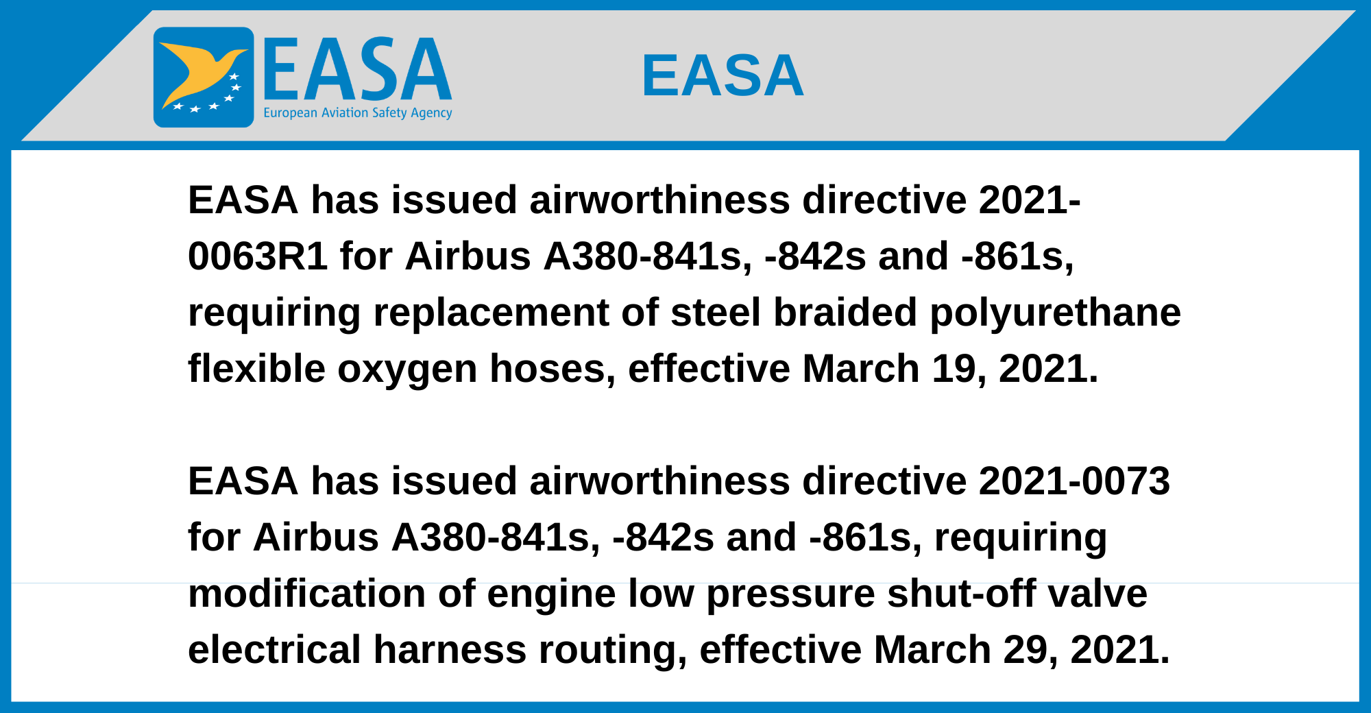 EASA has issued airworthiness directive 2021-0063R1 for Airbus A380-841s, -842s and -861s, requiring replacement of steel braided polyurethane flexible oxygen hoses, effective March 19, 2021.