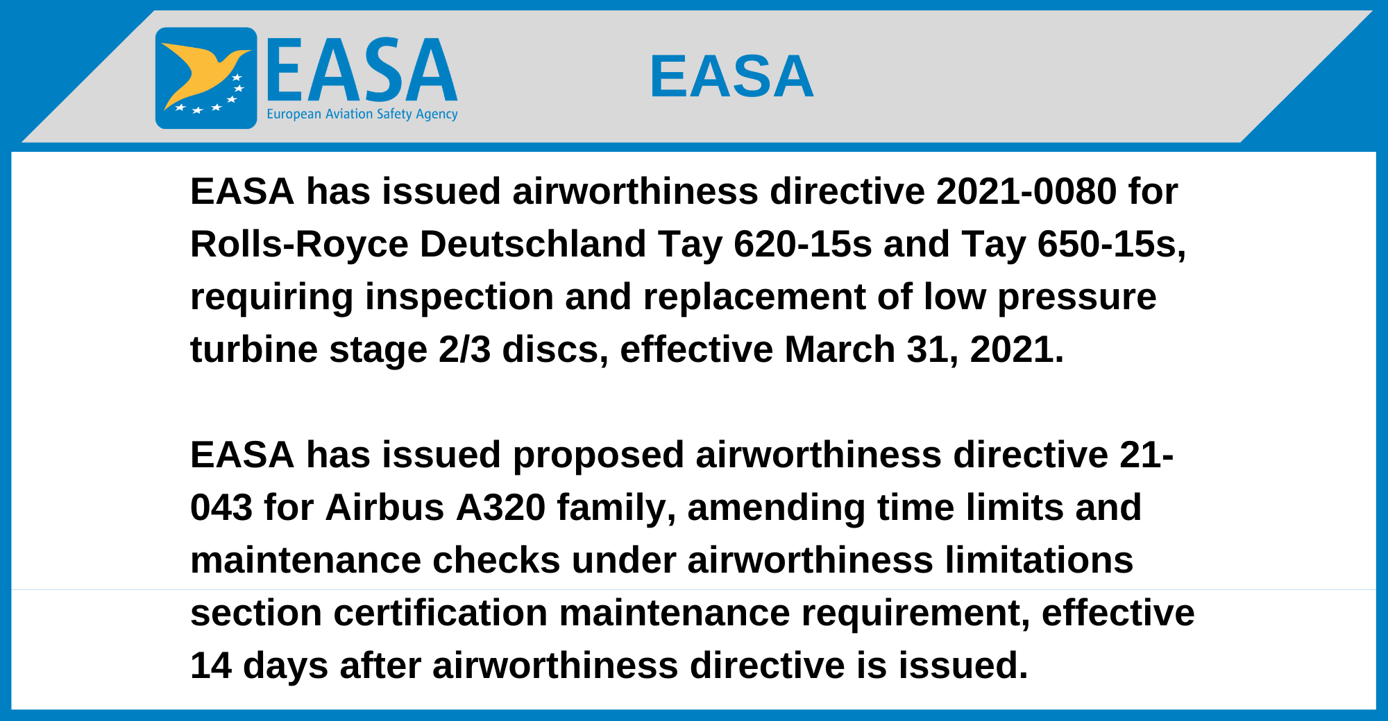 EASA has issued airworthiness directive 2021-0080 for Rolls-Royce Deutschland Tay 620-15s and Tay 650-15s, requiring inspection and replacement of low pressure turbine stage 2/3 discs, effective March 31, 2021.