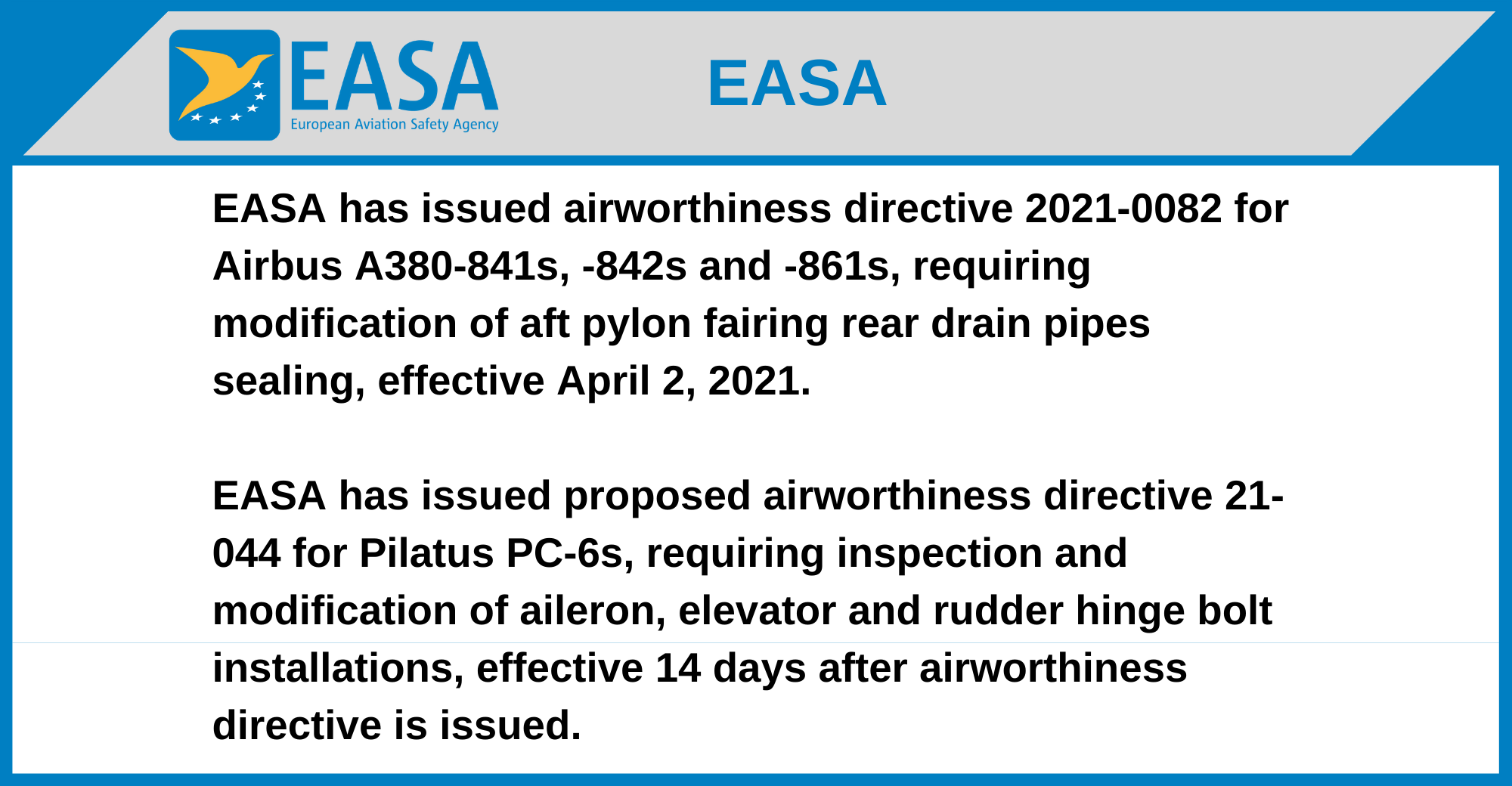 EASA has issued airworthiness directive 2021-0082 for Airbus A380-841s, -842s and -861s, requiring modification of aft pylon fairing rear drain pipes sealing, effective April 2, 2021.