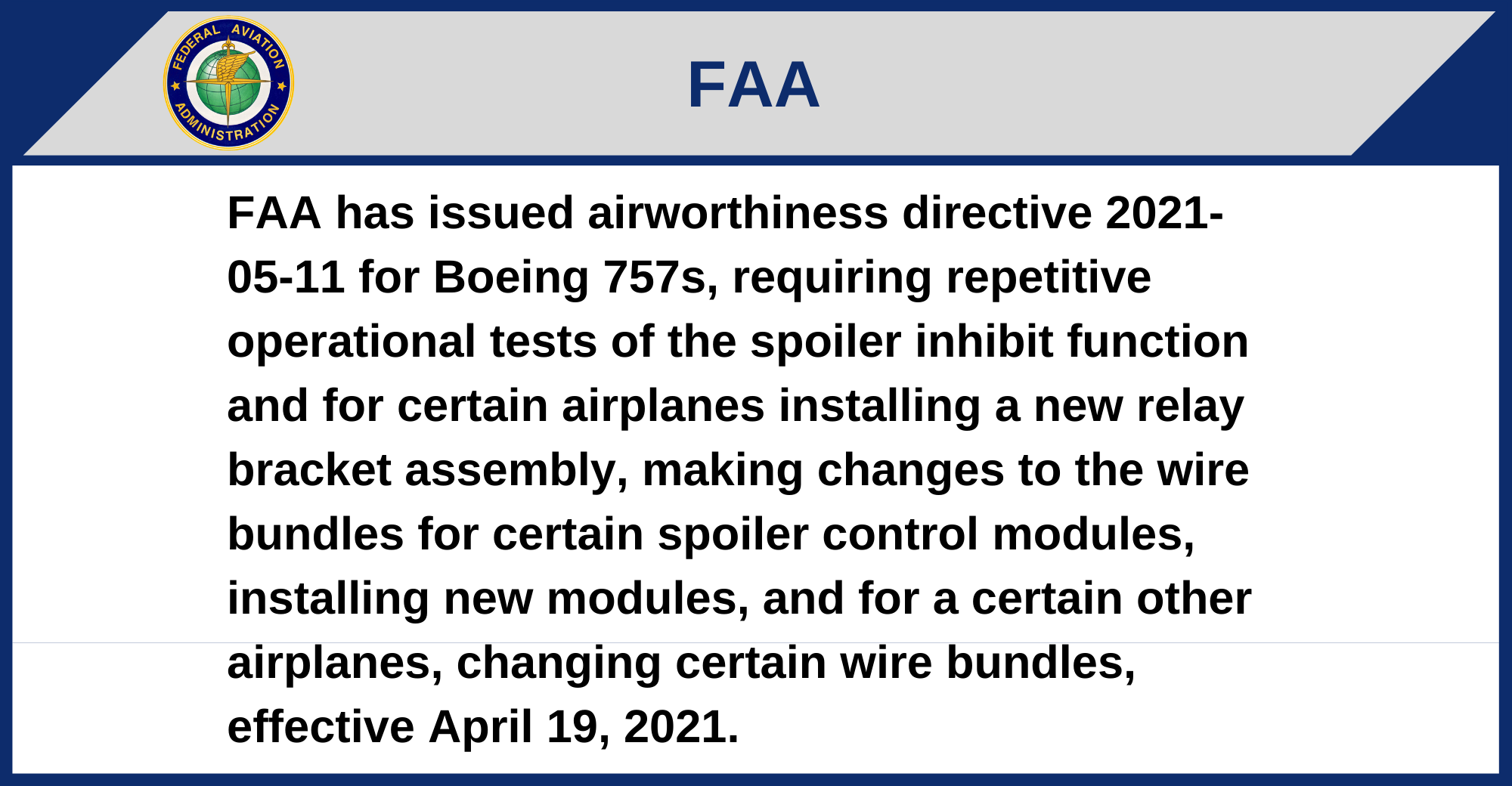 FAA has issued airworthiness directive 2021-05-11 for Boeing 757s, requiring repetitive operational tests of the spoiler inhibit function and for certain airplanes installing a new relay bracket assembly, making changes to the wire bundles for certain spoiler control modules, installing new modules, and for a certain other airplanes, changing certain wire bundles, effective April 19, 2021.