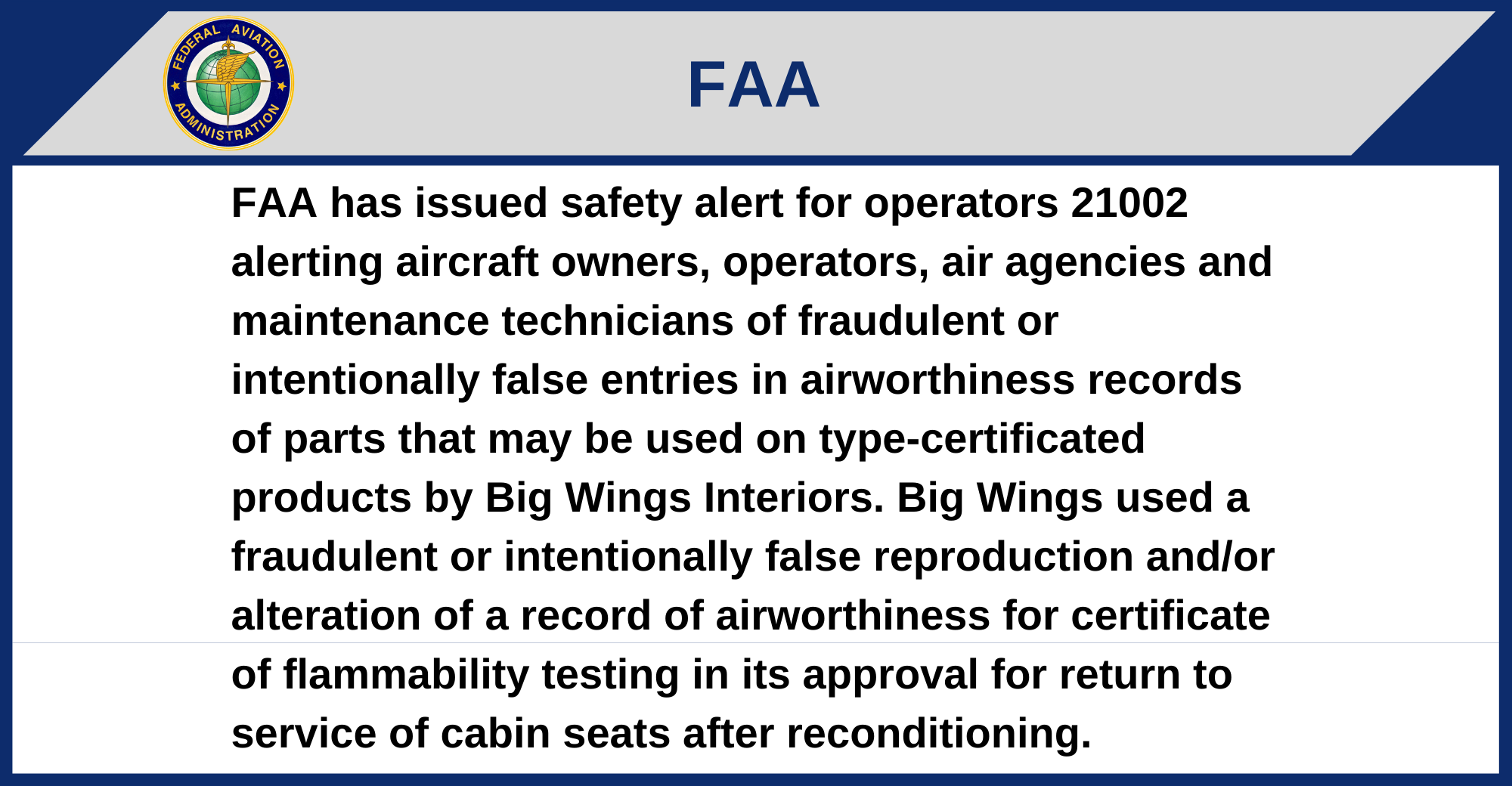 FAA has issued safety alert for operators 21002 alerting aircraft owners, operators, air agencies and maintenance technicians of fraudulent or intentionally false entries in airworthiness records of parts that may be used on type-certificated products by Big Wings Interiors. Big Wings used a fraudulent or intentionally false reproduction and/or alteration of a record of airworthiness for certificate of flammability testing in its approval for return to service of cabin seats after reconditioning.