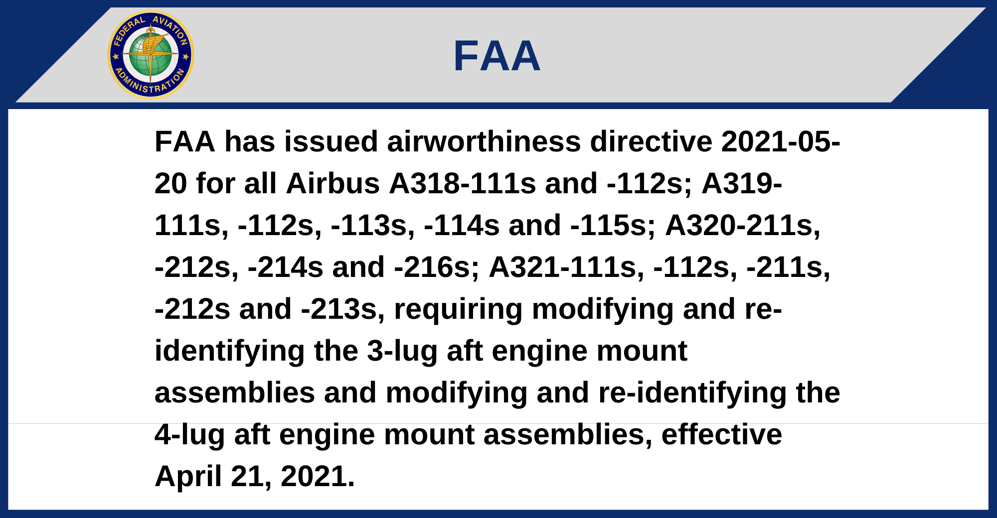 FAA has issued airworthiness directive 2021-05-20 for all Airbus A318-111s and -112s; A319-111s, -112s, -113s, -114s and -115s; A320-211s, -212s, -214s and -216s; A321-111s, -112s, -211s, -212s and -213s, requiring modifying and re-identifying the 3-lug aft engine mount assemblies and modifying and re-identifying the 4-lug aft engine mount assemblies, effective April 21, 2021.