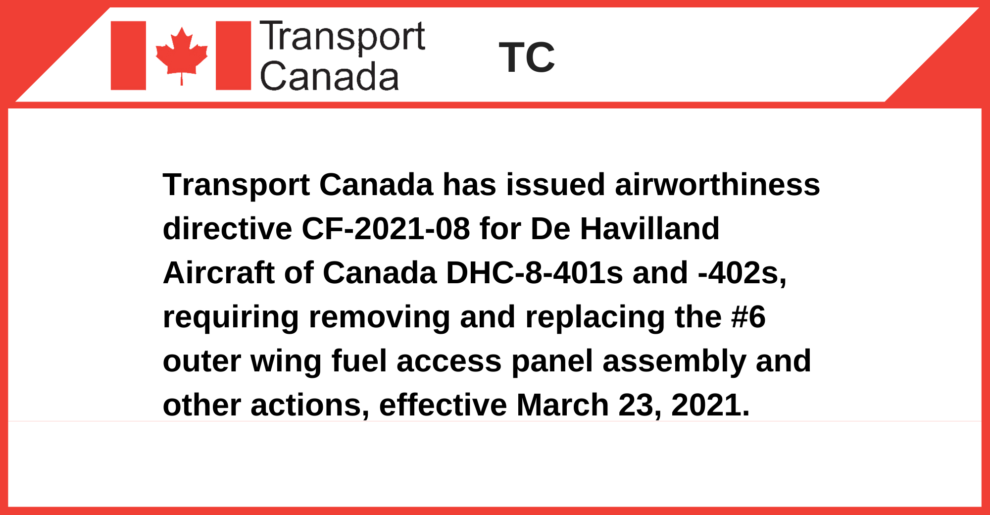 Transport Canada has issued airworthiness directive CF-2021-08 for De Havilland Aircraft of Canada DHC-8-401s and -402s, requiring removing and replacing the #6 outer wing fuel access panel assembly and other actions, effective March 23, 2021.
