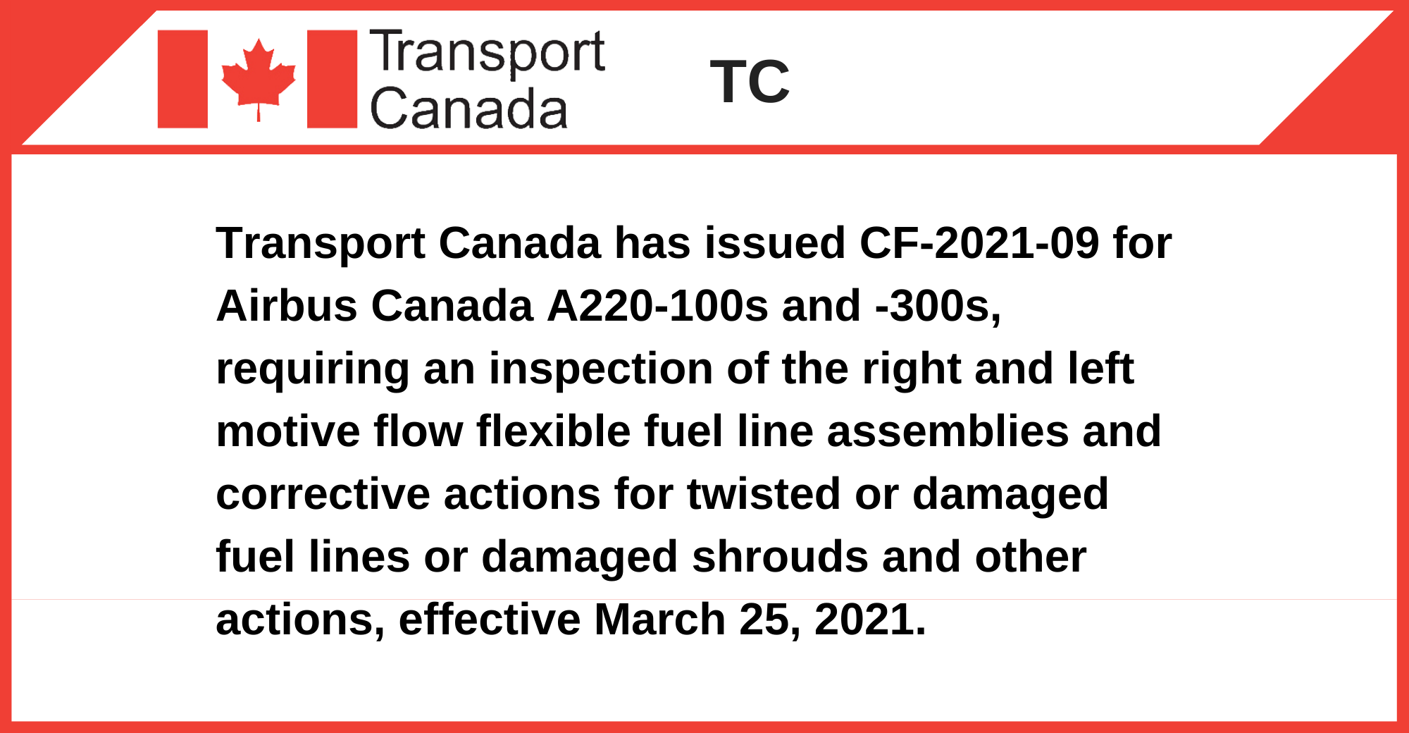 Transport Canada has issued CF-2021-09 for Airbus Canada A220-100s and -300s, requiring an inspection of the right and left motive flow flexible fuel line assemblies and corrective actions for twisted or damaged fuel lines or damaged shrouds and other actions, effective March 25, 2021.