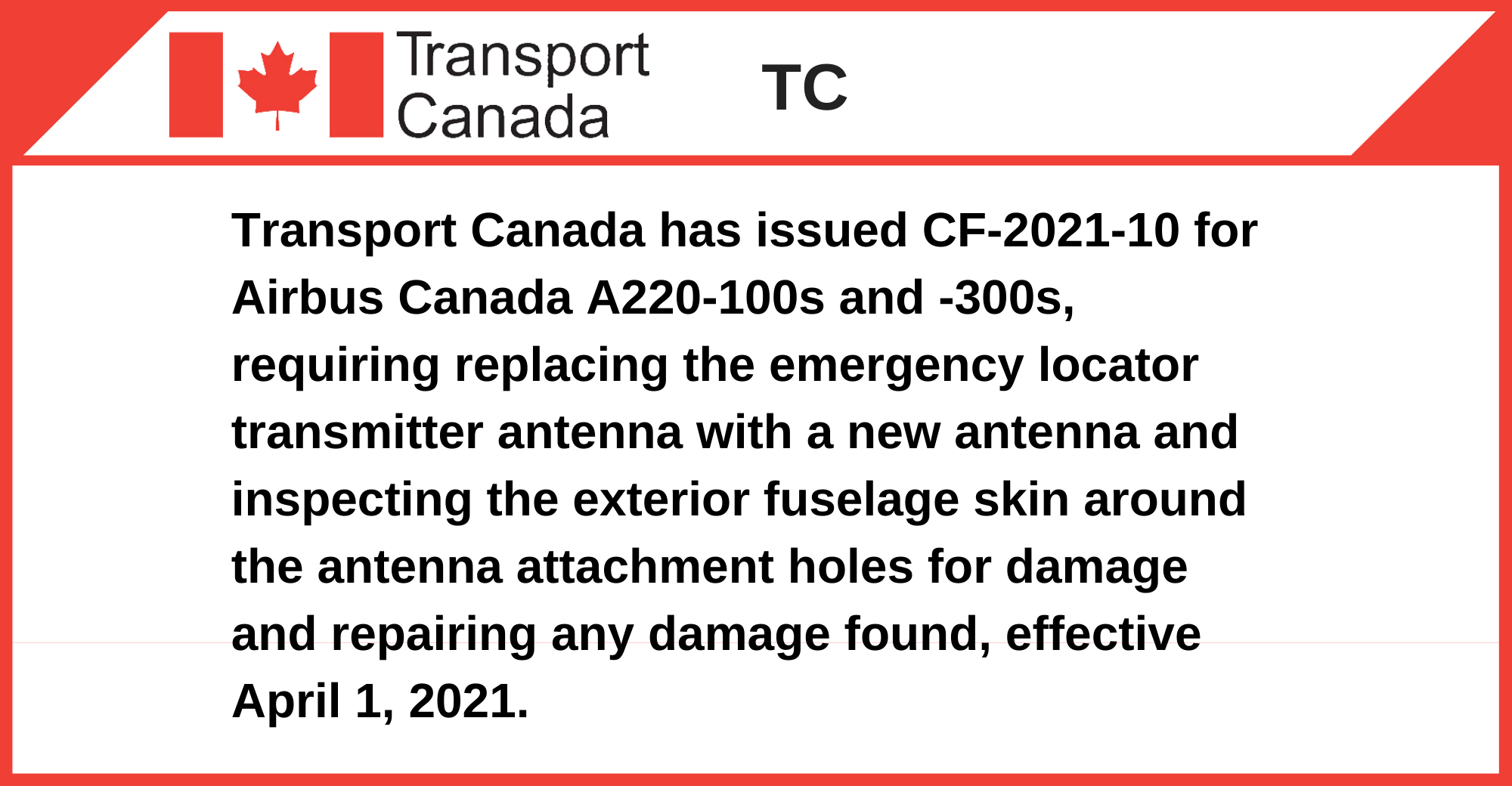 Transport Canada has issued CF-2021-10 for Airbus Canada A220-100s and -300s, requiring replacing the emergency locator transmitter antenna with a new antenna and inspecting the exterior fuselage skin around the antenna attachment holes for damage and repairing any damage found, effective April 1, 2021.