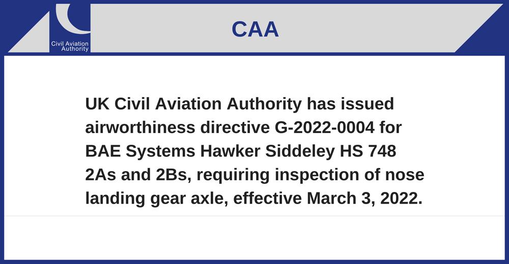 UK Civil Aviation Authority has issued airworthiness directive G-2022-0004 for BAE Systems Hawker Siddeley HS 748 2As and 2Bs, requiring inspection of nose landing gear axle, effective March 3, 2022.