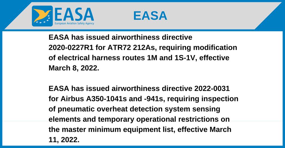 EASA has issued airworthiness directive 2022-0031 for Airbus A350-1041s and -941s, requiring inspection of pneumatic overheat detection system sensing elements and temporary operational restrictions on the master minimum equipment list, effective March 11, 2022.