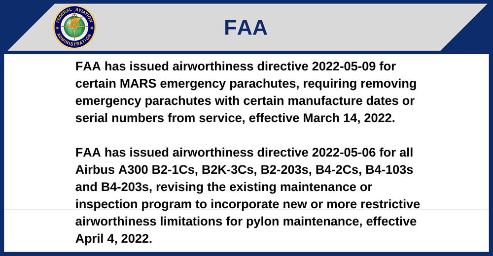 FAA has issued airworthiness directive 2022-05-09 for certain MARS emergency parachutes, requiring removing emergency parachutes with certain manufacture dates or serial numbers from service, effective March 14, 2022.