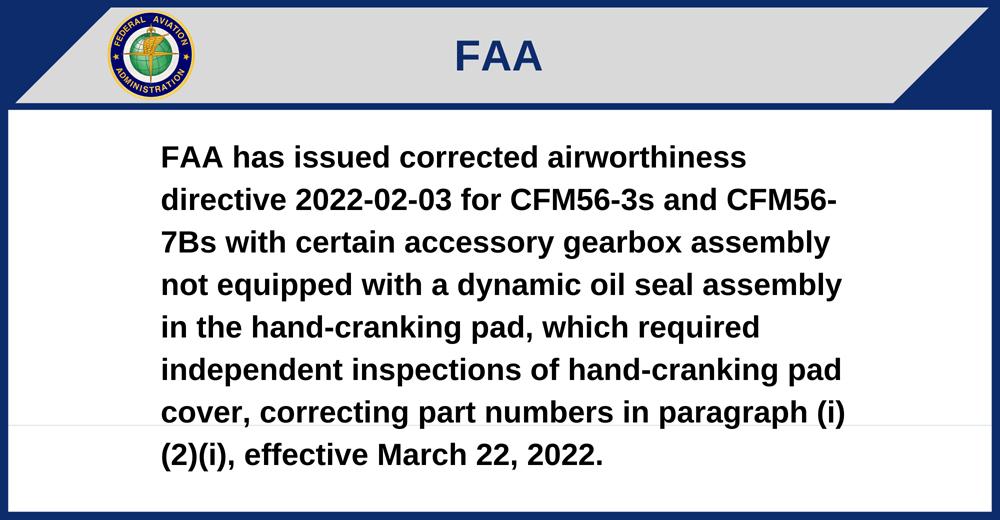 FAA has issued corrected airworthiness directive 2022-02-03 for CFM56-3s and CFM56-7Bs with certain accessory gearbox assembly not equipped with a dynamic oil seal assembly in the hand-cranking pad, which required independent inspections of hand-cranking pad cover, correcting part numbers in paragraph (i)(2)(i), effective March 22, 2022.