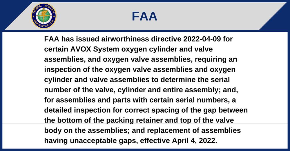 FAA has issued airworthiness directive 2022-04-09 for certain AVOX System oxygen cylinder and valve assemblies, and oxygen valve assemblies, requiring an inspection of the oxygen valve assemblies and oxygen cylinder and valve assemblies to determine the serial number of the valve, cylinder and entire assembly; and, for assemblies and parts with certain serial numbers, a detailed inspection for correct spacing of the gap between the bottom of the packing retainer and top of the valve body on the assemblies; and replacement of assemblies having unacceptable gaps, effective April 4, 2022.