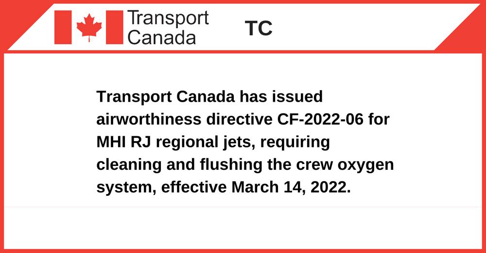 Transport Canada has issued airworthiness directive CF-2022-06 for MHI RJ regional jets, requiring cleaning and flushing the crew oxygen system, effective March 14, 2022.