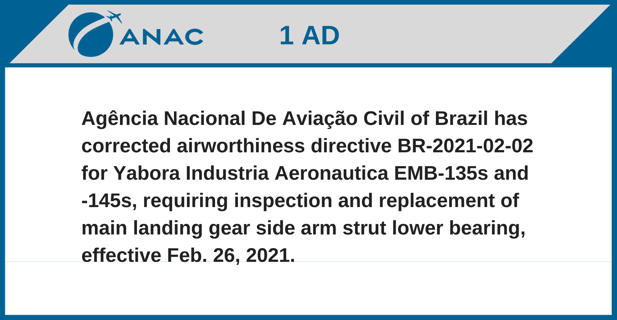 Agência Nacional De Aviação Civil of Brazil has corrected airworthiness directive BR-2021-02-02 for Yabora Industria Aeronautica EMB-135s and -145s, requiring inspection and replacement of main landing gear side arm strut lower bearing, effective Feb. 26, 2021.