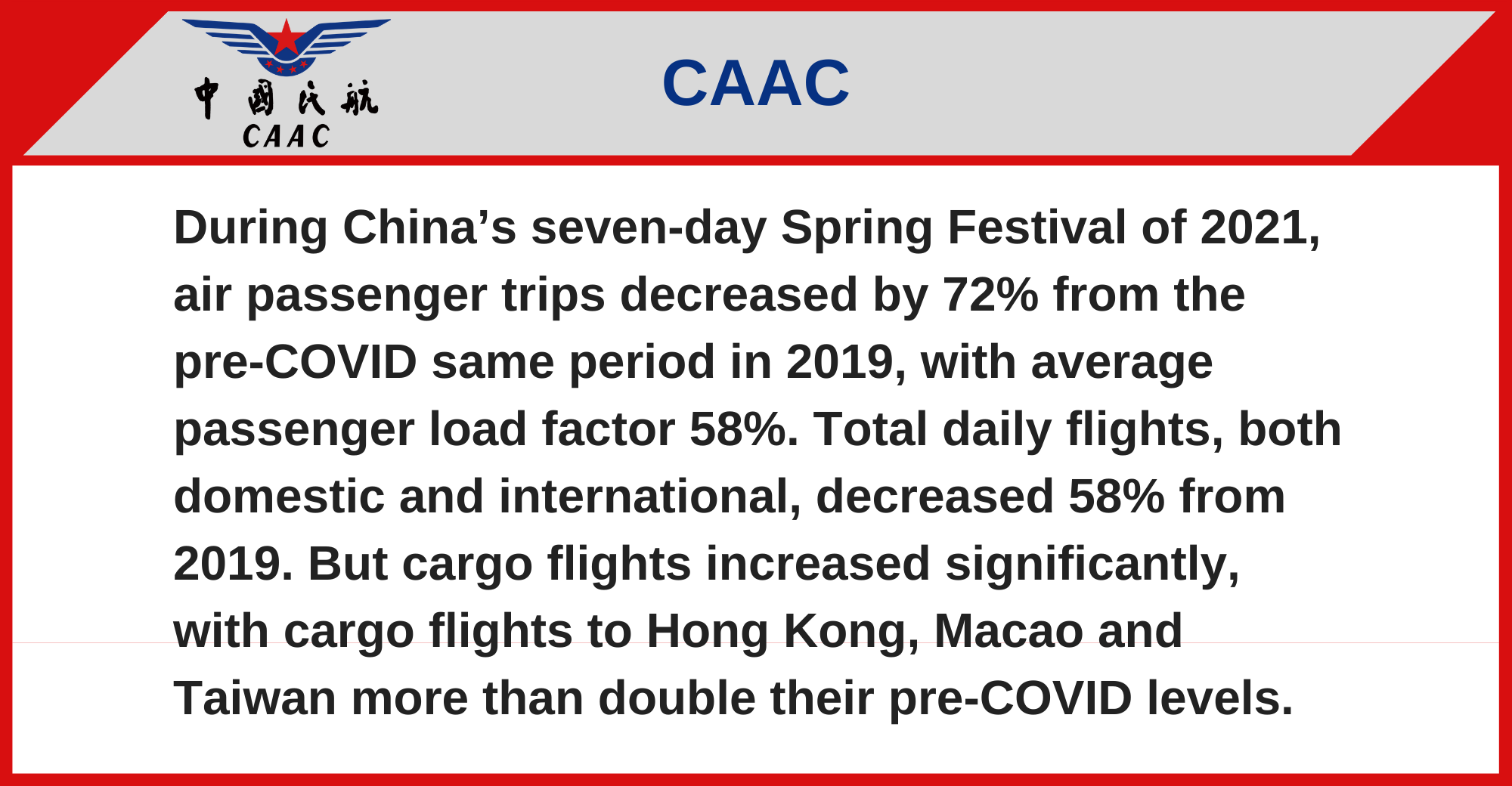 During China’s seven-day Spring Festival of 2021, air passenger trips decreased by 72% from the pre-COVID same period in 2019, with average passenger load factor 58%. Total daily flights, both domestic and international, decreased 58% from 2019. But cargo flights increased significantly, with cargo flights to Hong Kong, Macao and Taiwan more than double their pre-COVID levels.