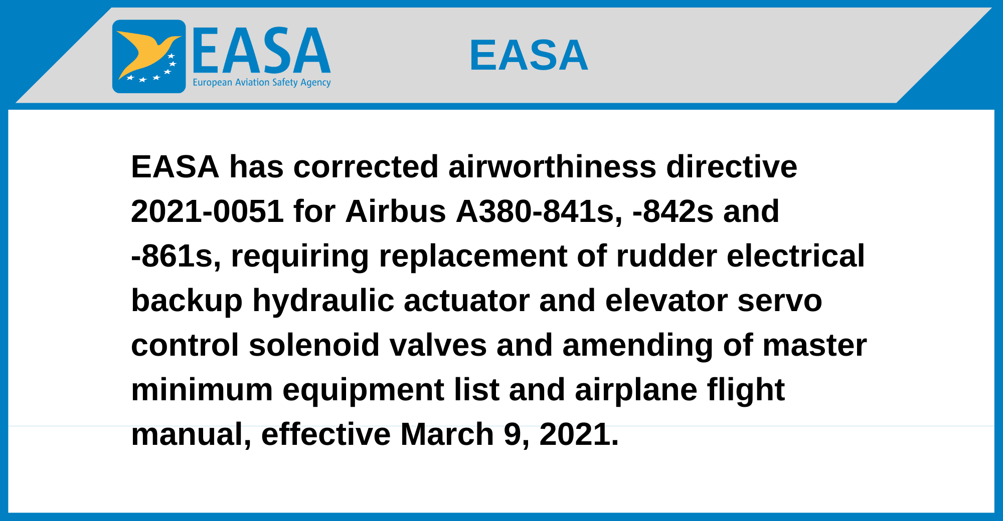 EASA has corrected airworthiness directive 2021-0051 for Airbus A380-841s, -842s and -861s, requiring replacement of rudder electrical backup hydraulic actuator and elevator servo control solenoid valves and amending of master minimum equipment list and airplane flight manual, effective March 9, 2021.