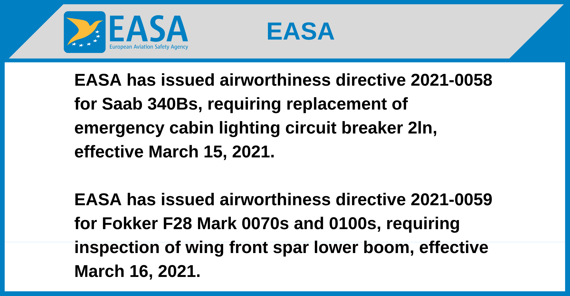 EASA has issued airworthiness directive 2021-0058 for Saab 340Bs, requiring replacement of emergency cabin lighting circuit breaker 2ln, effective March 15, 2021.