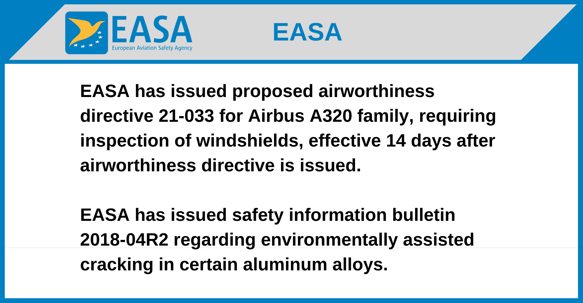 EASA has issued proposed airworthiness directive 21-033 for Airbus A320 family, requiring inspection of windshields, effective 14 days after airworthiness directive is issued.
