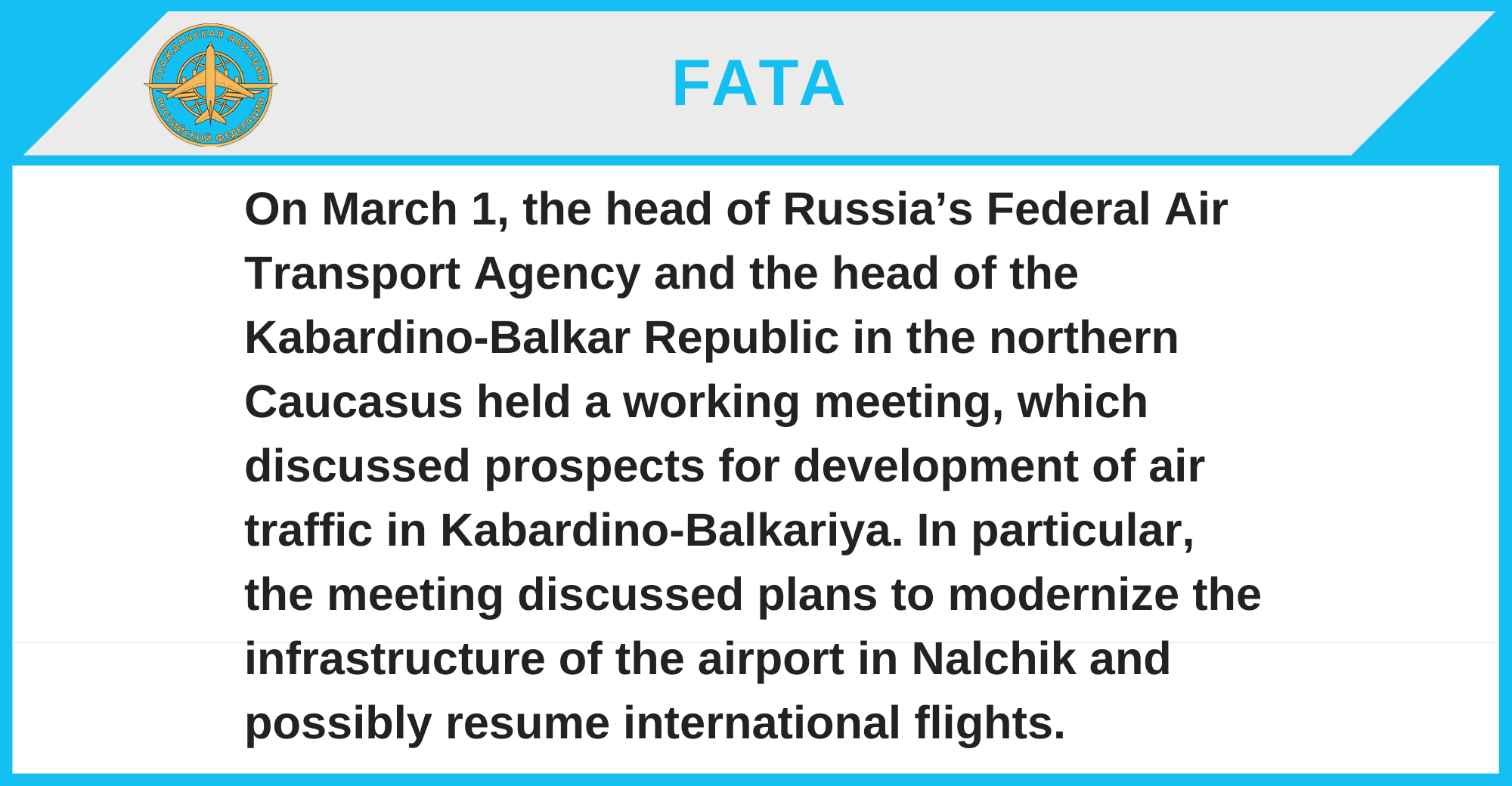 On March 1, the head of Russia’s Federal Air Transport Agency and the head of the Kabardino-Balkar Republic in the northern Caucasus held a working meeting, which discussed prospects for development of air traffic in Kabardino-Balkariya. In particular, the meeting discussed plans to modernize the infrastructure of the airport in Nalchik and possibly resume international flights.