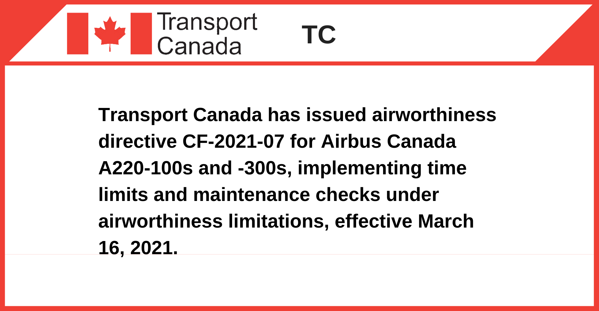 Transport Canada has issued airworthiness directive CF-2021-07 for Airbus Canada A220-100s and -300s, implementing time limits and maintenance checks under airworthiness limitations, effective March 16, 2021.