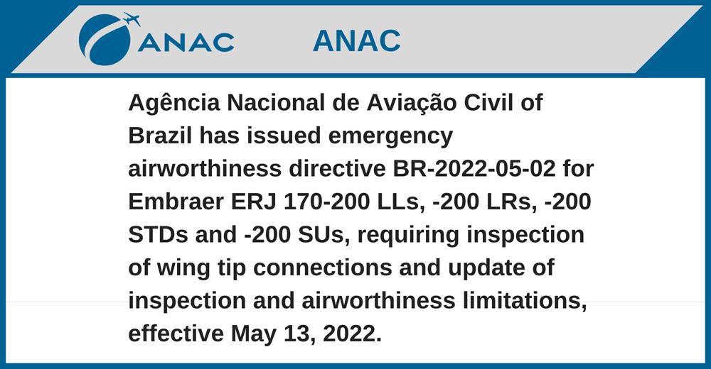 Agência Nacional de Aviação Civil of Brazil has issued emergency airworthiness directive BR-2022-05-02 for Embraer ERJ 170-200 LLs, -200 LRs, -200 STDs and -200 SUs, requiring inspection of wing tip connections and update of inspection and airworthiness limitations, effective May 13, 2022.