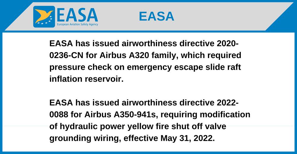 EASA has issued airworthiness directive 2020-0236-CN for Airbus A320 family, which required pressure check on emergency escape slide raft inflation reservoir.