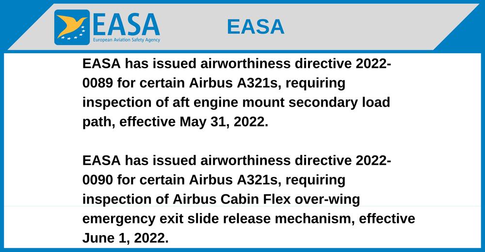 EASA has issued airworthiness directive 2022-0090 for certain Airbus A321s, requiring inspection of Airbus Cabin Flex over-wing emergency exit slide release mechanism, effective June 1, 2022.