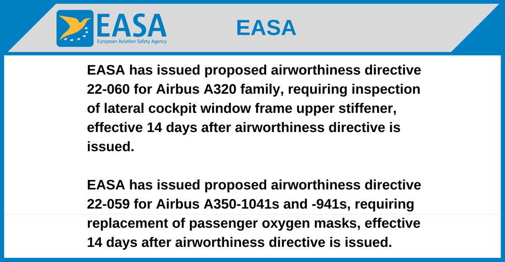 EASA has issued proposed airworthiness directive 22-059 for Airbus A350-1041s and -941s, requiring replacement of passenger oxygen masks, effective 14 days after airworthiness directive is issued.
