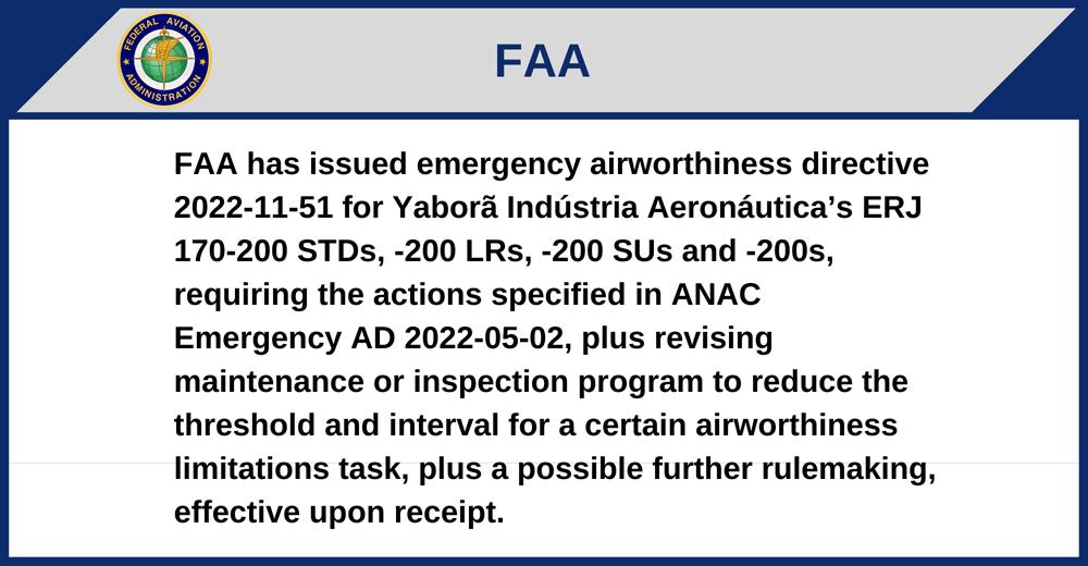 FAA has issued emergency airworthiness directive 2022-11-51 for Yaborã Indústria Aeronáutica’s ERJ 170-200 STDs, -200 LRs, -200 SUs and -200s, requiring the actions specified in ANAC Emergency AD 2022-05-02, plus revising maintenance or inspection program to reduce the threshold and interval for a certain airworthiness limitations task, plus a possible further rulemaking, effective upon receipt.