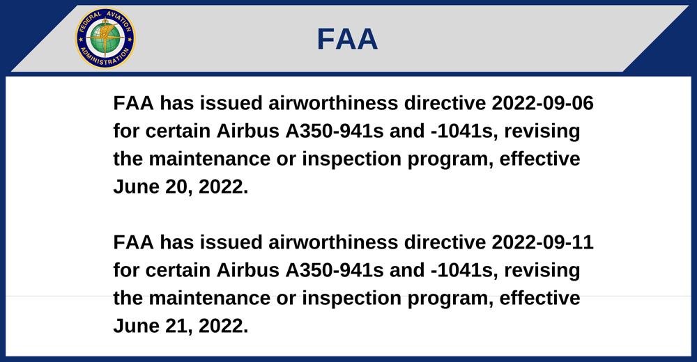 FAA has issued airworthiness directive 2022-09-06 for certain Airbus A350-941s and -1041s, revising the maintenance or inspection program, effective June 20, 2022.