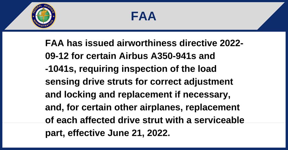 FAA has issued airworthiness directive 2022-09-12 for certain Airbus A350-941s and -1041s, requiring inspection of the load sensing drive struts for correct adjustment and locking and replacement if necessary, and, for certain other airplanes, replacement of each affected drive strut with a serviceable part, effective June 21, 2022.