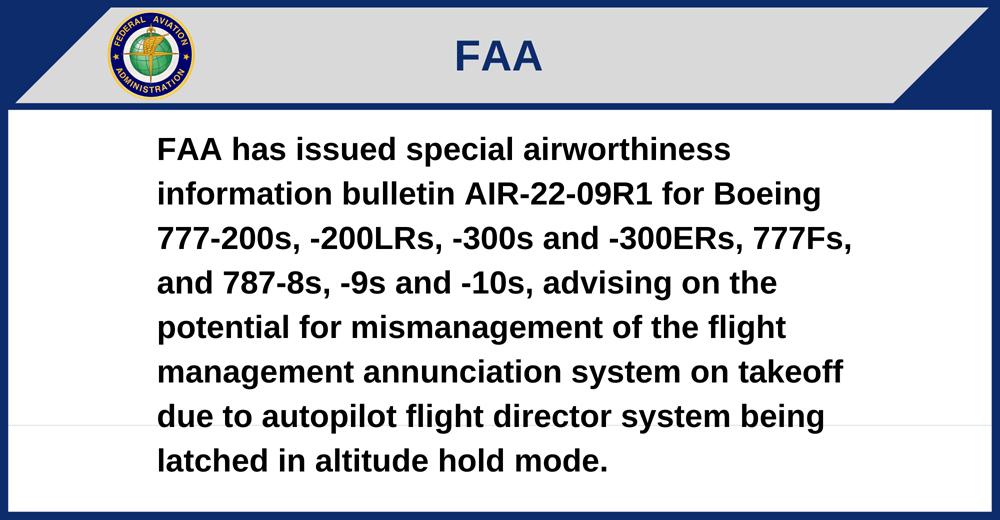 FAA has issued special airworthiness information bulletin AIR-22-09R1 for Boeing 777-200s, -200LRs, -300s and -300ERs, 777Fs, and 787-8s, -9s and -10s, advising on the potential for mismanagement of the flight management annunciation system on takeoff due to autopilot flight director system being latched in altitude hold mode.