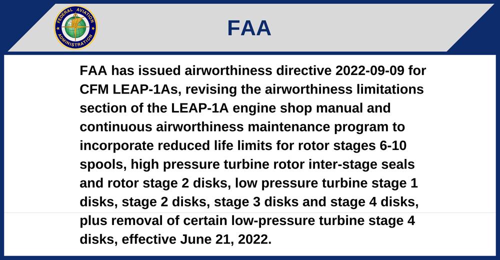 FAA has issued airworthiness directive 2022-09-09 for CFM LEAP-1As, revising the airworthiness limitations section of the LEAP-1A engine shop manual and continuous airworthiness maintenance program to incorporate reduced life limits for rotor stages 6-10 spools, high pressure turbine rotor inter-stage seals and rotor stage 2 disks, low pressure turbine stage 1 disks, stage 2 disks, stage 3 disks and stage 4 disks, plus removal of certain low-pressure turbine stage 4 disks, effective June 21, 2022.