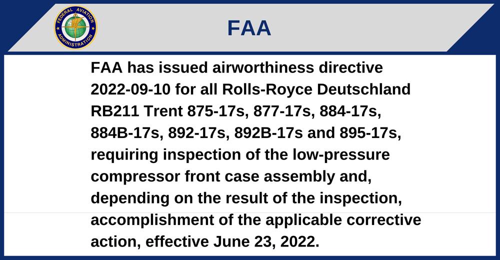FAA has issued airworthiness directive 2022-09-10 for all Rolls-Royce Deutschland RB211 Trent 875-17s, 877-17s, 884-17s, 884B-17s, 892-17s, 892B-17s and 895-17s, requiring inspection of the low-pressure compressor front case assembly and, depending on the result of the inspection, accomplishment of the applicable corrective action, effective June 23, 2022.