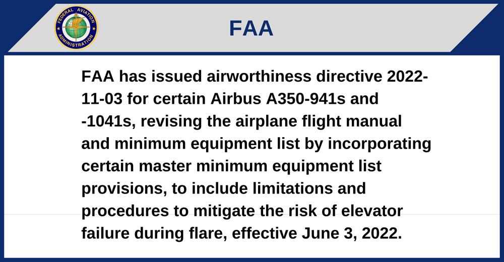 FAA has issued airworthiness directive 2022-11-03 for certain Airbus A350-941s and -1041s, revising the airplane flight manual and minimum equipment list by incorporating certain master minimum equipment list provisions, to include limitations and procedures to mitigate the risk of elevator failure during flare, effective June 3, 2022.