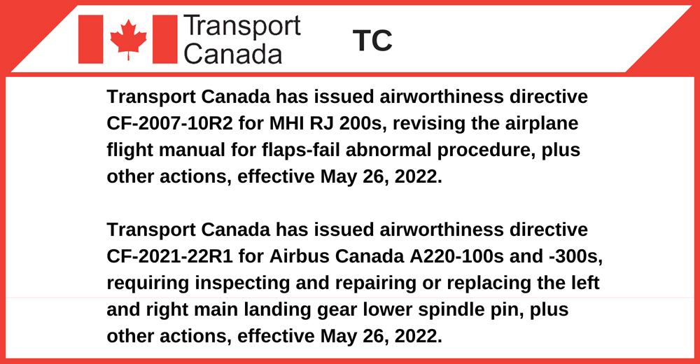 Transport Canada has issued airworthiness directive CF-2007-10R2 for MHI RJ 200s, revising the airplane flight manual for flaps-fail abnormal procedure, plus other actions, effective May 26, 2022.