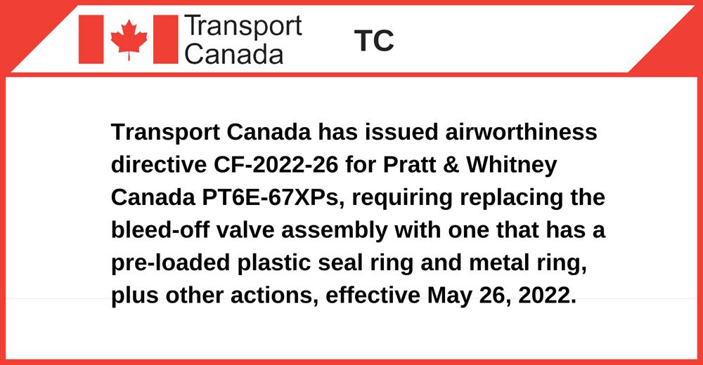 Transport Canada has issued airworthiness directive CF-2022-26 for Pratt & Whitney Canada PT6E-67XPs, requiring replacing the bleed-off valve assembly with one that has a pre-loaded plastic seal ring and metal ring, plus other actions, effective May 26, 2022.