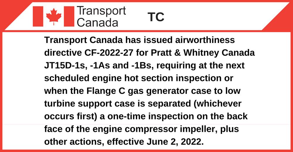 Transport Canada has issued airworthiness directive CF-2022-27 for Pratt & Whitney Canada JT15D-1s, -1As and -1Bs, requiring at the next scheduled engine hot section inspection or when the Flange C gas generator case to low turbine support case is separated (whichever occurs first) a one-time inspection on the back face of the engine compressor impeller, plus other actions, effective June 2, 2022.