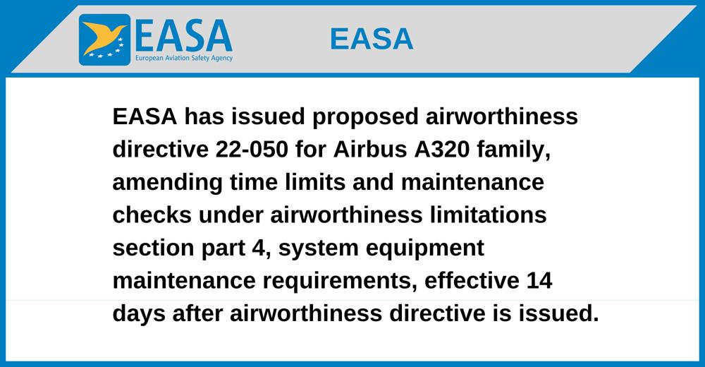 EASA has issued proposed airworthiness directive 22-050 for Airbus A320 family, amending time limits and maintenance checks under airworthiness limitations section part 4, system equipment maintenance requirements, effective 14 days after airworthiness directive is issued.