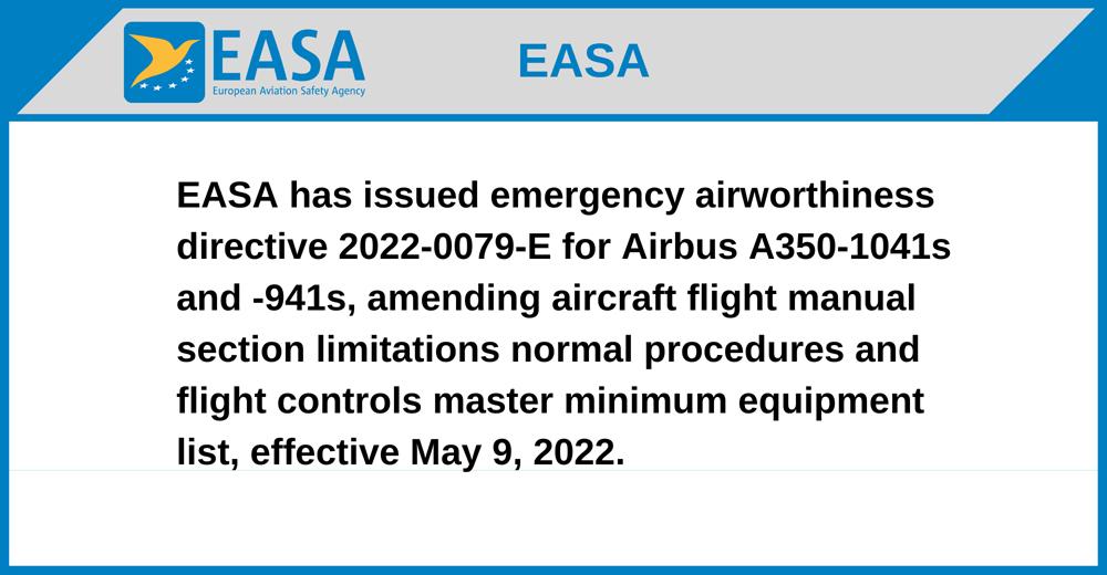 EASA has issued emergency airworthiness directive 2022-0079-E for Airbus A350-1041s and -941s, amending aircraft flight manual section limitations normal procedures and flight controls master minimum equipment list, effective May 9, 2022.
