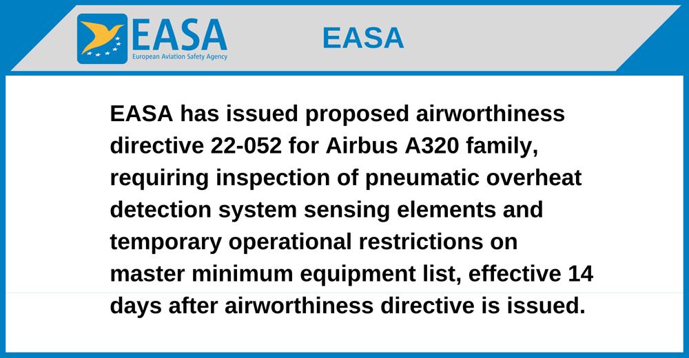 EASA has issued proposed airworthiness directive 22-052 for Airbus A320 family, requiring inspection of pneumatic overheat detection system sensing elements and temporary operational restrictions on master minimum equipment list, effective 14 days after airworthiness directive is issued.