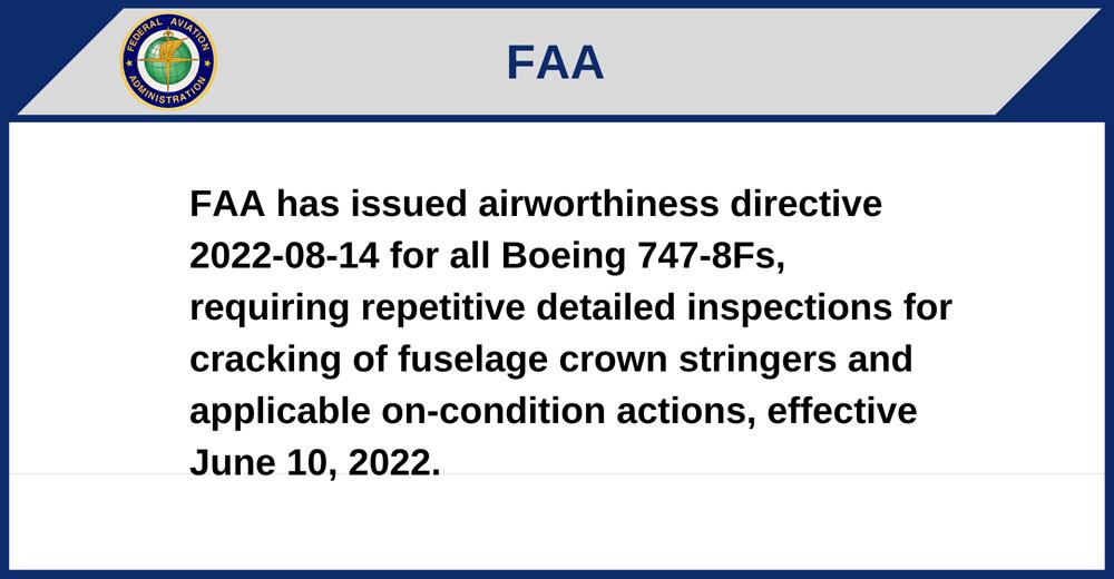 FAA has issued airworthiness directive 2022-08-14 for all Boeing 747-8Fs, requiring repetitive detailed inspections for cracking of fuselage crown stringers and applicable on-condition actions, effective June 10, 2022.