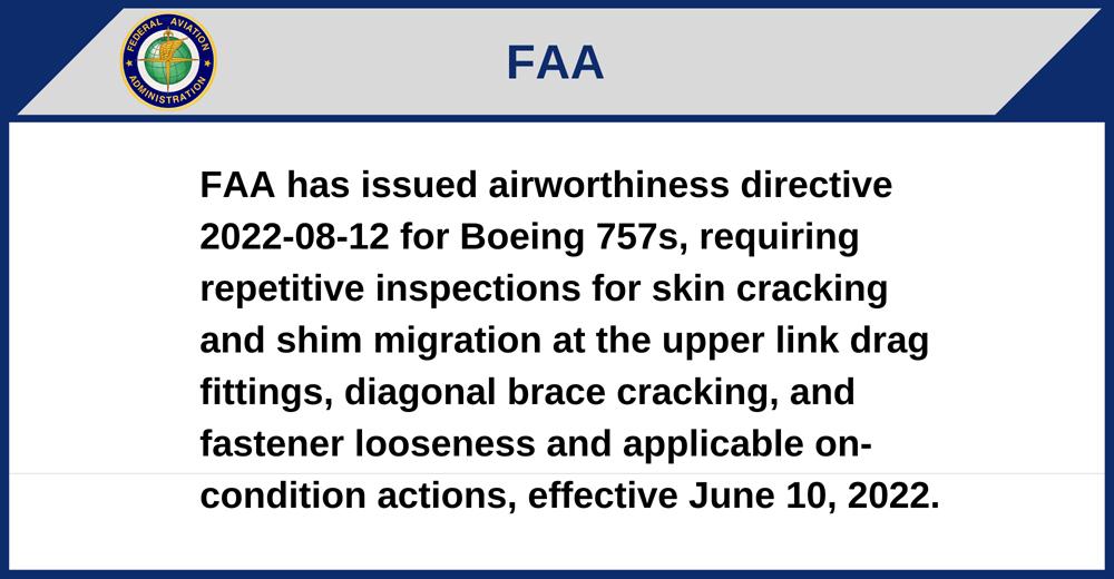 FAA has issued airworthiness directive 2022-08-12 for Boeing 757s, requiring repetitive inspections for skin cracking and shim migration at the upper link drag fittings, diagonal brace cracking, and fastener looseness and applicable on-condition actions, effective June 10, 2022.