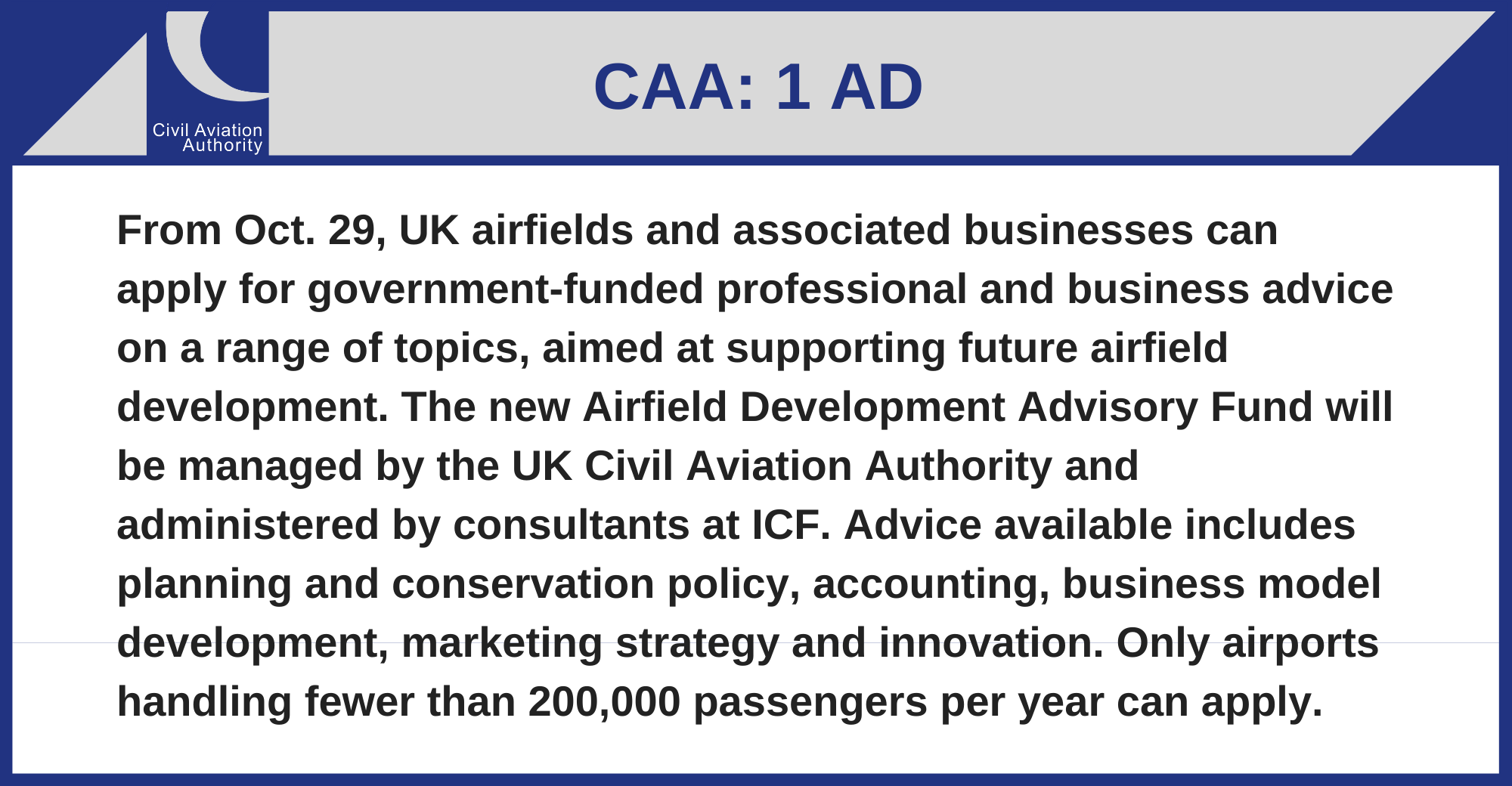 From Oct. 29, UK airfields and associated businesses can apply for government-funded professional and business advice on a range of topics, aimed at supporting future airfield development. The new Airfield Development Advisory Fund will be managed by the UK Civil Aviation Authority and administered by consultants at ICF. Advice available includes planning and conservation policy, accounting, business model development, marketing strategy and innovation. Only airports handling fewer than 200,000 passengers per year can apply.