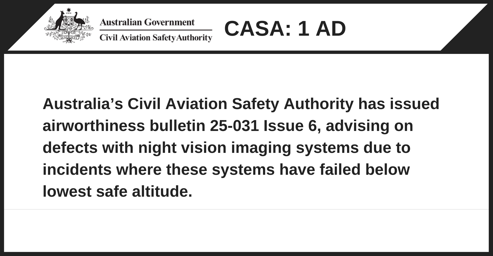 Australia’s Civil Aviation Safety Authority has issued airworthiness bulletin 25-031 Issue 6, advising on defects with night vision imaging systems due to incidents where these systems have failed below lowest safe altitude.