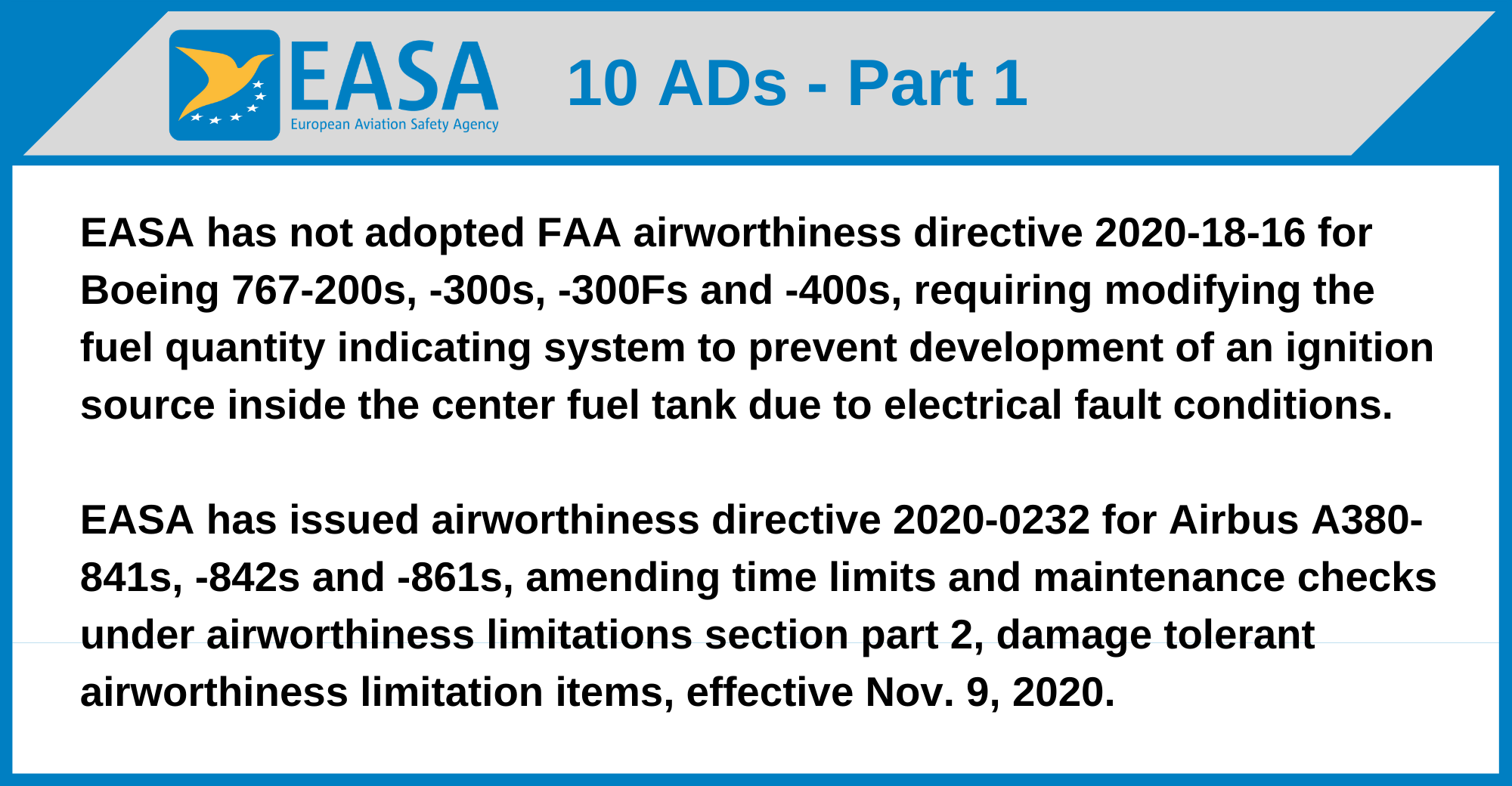 EASA has not adopted FAA airworthiness directive 2020-18-16 for Boeing 767-200s, -300s, -300Fs and -400s, requiring modifying the fuel quantity indicating system to prevent development of an ignition source inside the center fuel tank due to electrical fault conditions.