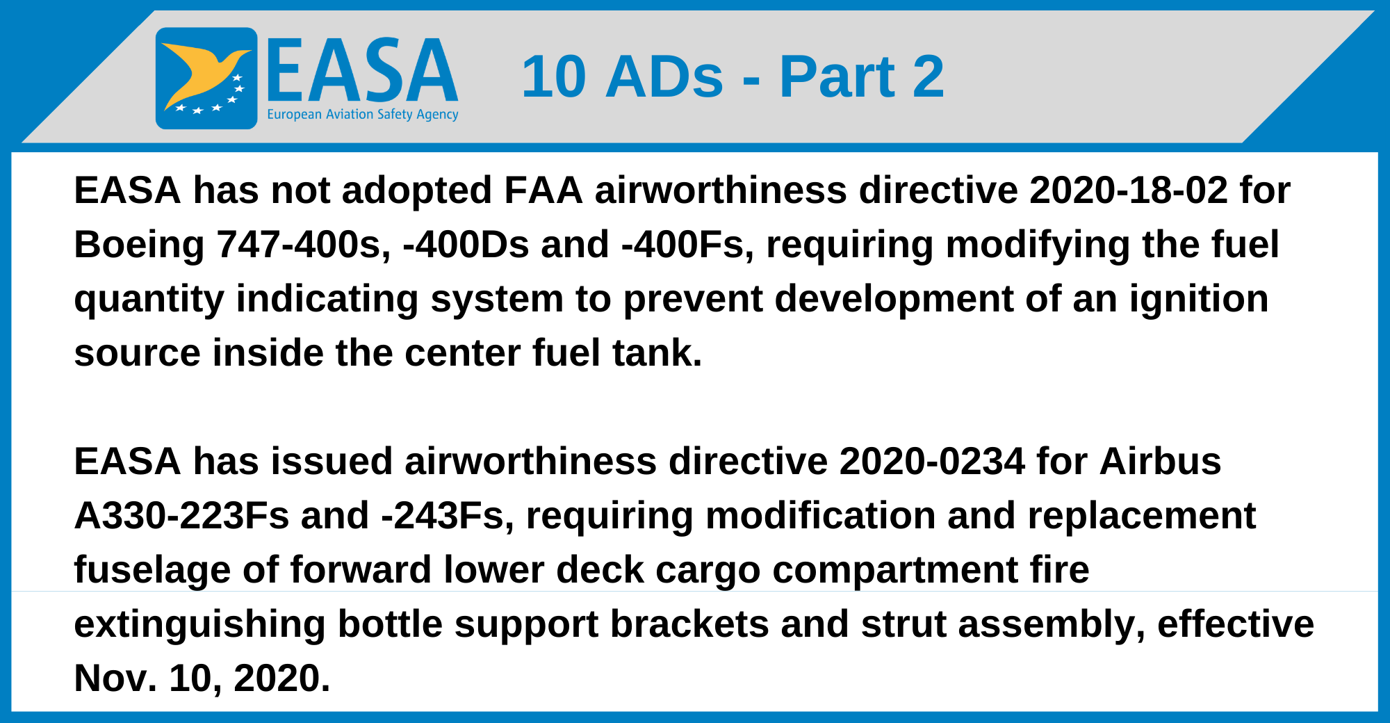 EASA has not adopted FAA airworthiness directive 2020-18-02 for Boeing 747-400s, -400Ds and -400Fs, requiring modifying the fuel quantity indicating system to prevent development of an ignition source inside the center fuel tank.